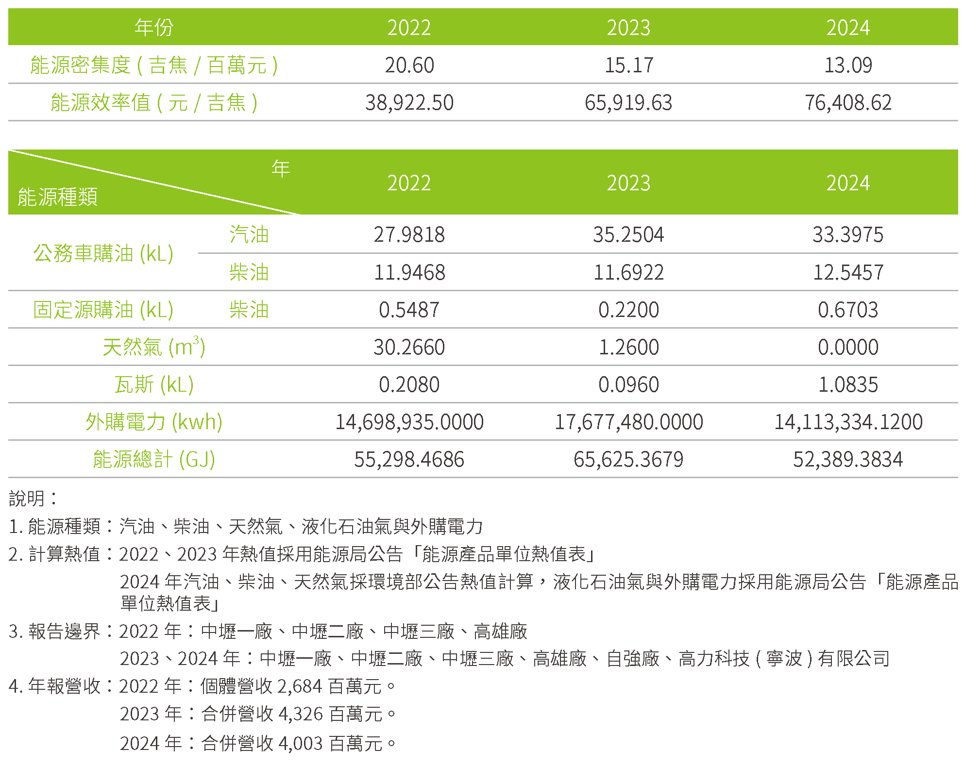 本公司每年都會推動節約能源措施,例如選購高效能機種、持續汰換老舊機器設備、生產排程優 化等。利用眾人智慧達成節能減碳目標,未來將持續改善製程,減少能源消耗,努力朝綠色企業、 永續經營方向邁進。2024 年能源密集度較 2023 年減少 13.71%。