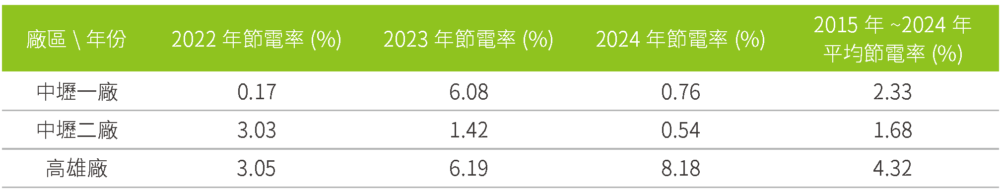 各廠區遵循經濟部能源局法規,能源管理法第 9 條規定列管台電用電契約達 800KW 以上能源用戶, 每年回報年度能源成效以及能源改善計畫,成效目標:「年度節電率」或「平均年節電率」大於 1%。 分別為中壢二廠以及高雄本州廠,已指派專責能源管理師,落實節約能源措施計畫,達成平均年節電率大於 1% 以上。