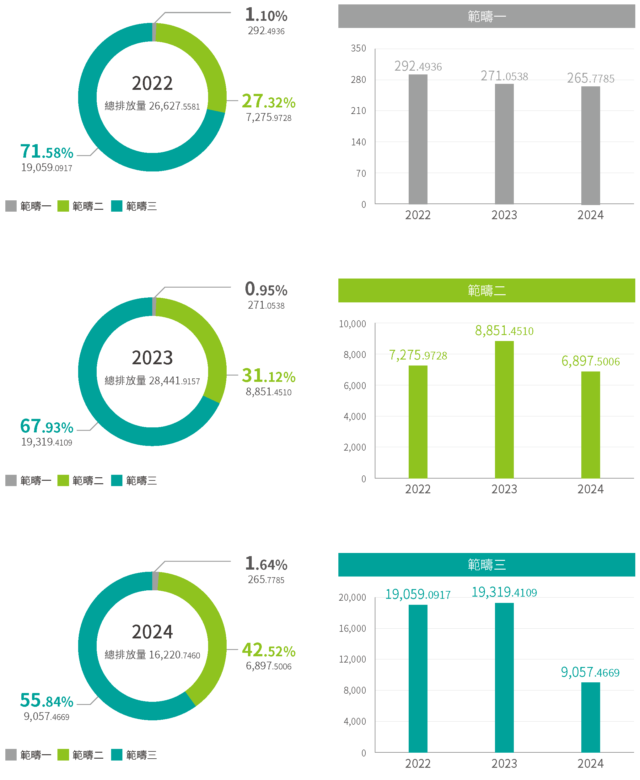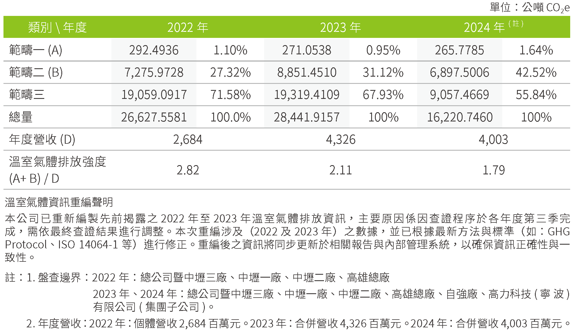 2024年較2023年減少 15.14%。自2021年起開始導入ISO 14064-1:2018溫室氣體盤查標準,已連續三年通過第三方查驗驗證,達成率 100%