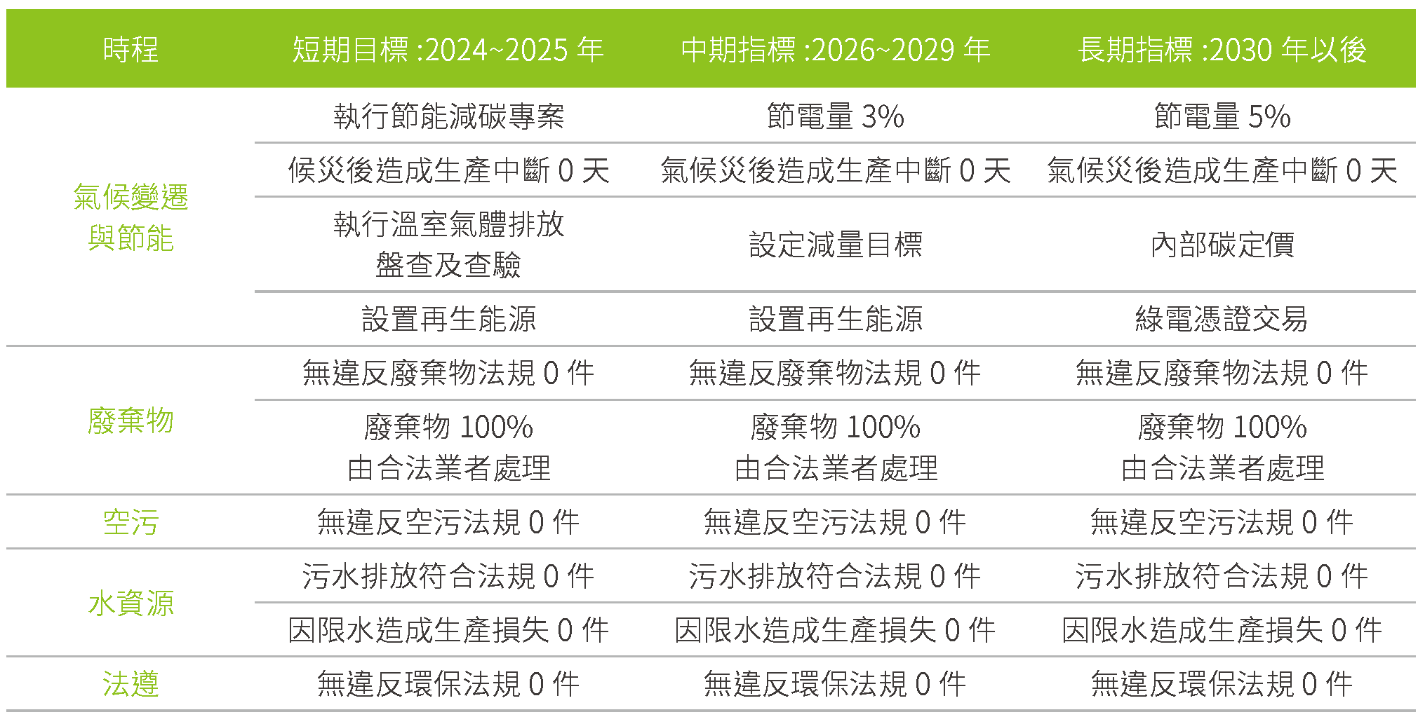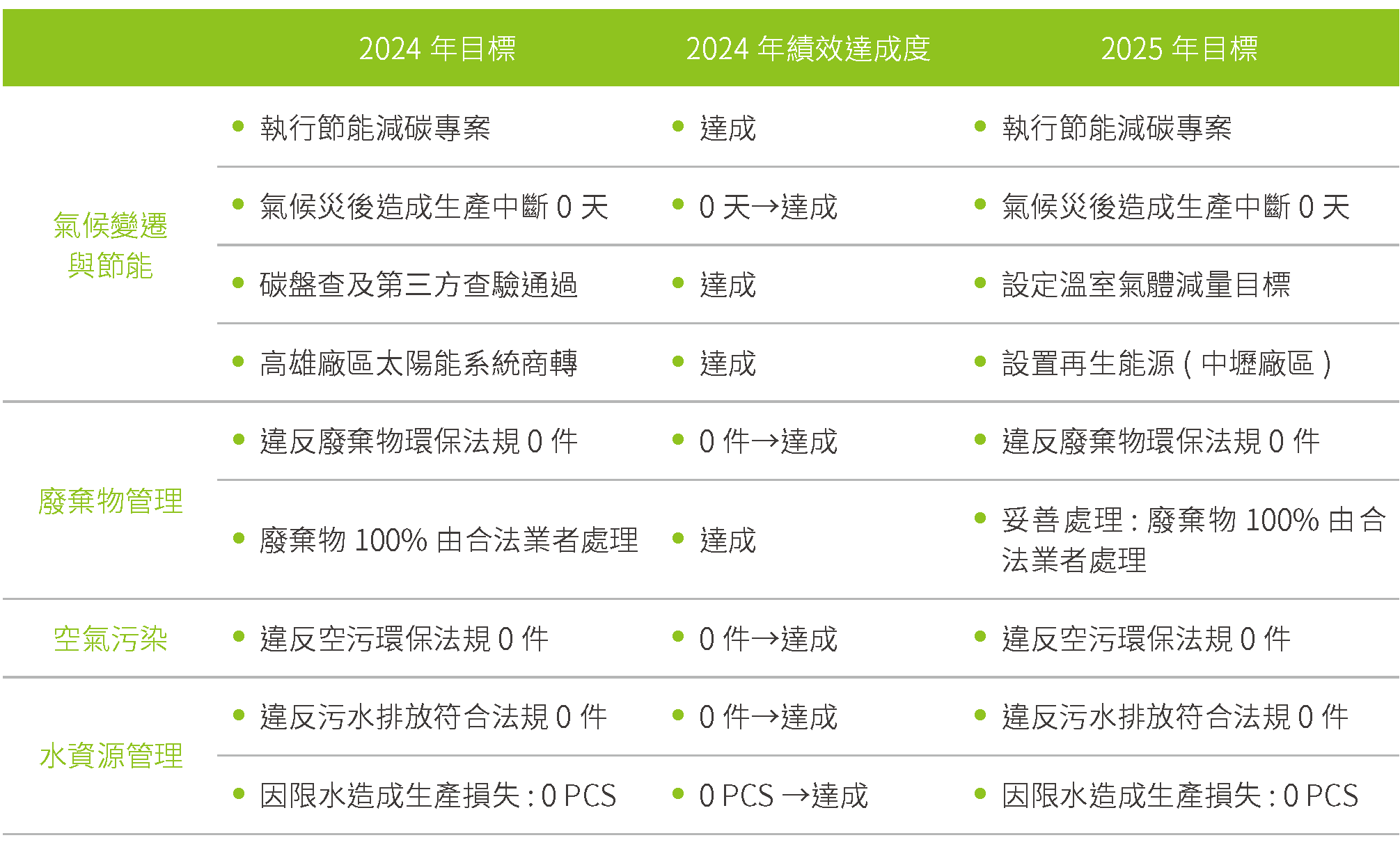 高力承諾為善盡環境保護責任,成為永續發展之企業持續改善,依據上述節能減碳短中長期指標與相關執行計畫並做到最近二年績效目標與達成度 ( 如下表 ),以降低對社會與環境的可能衝擊。