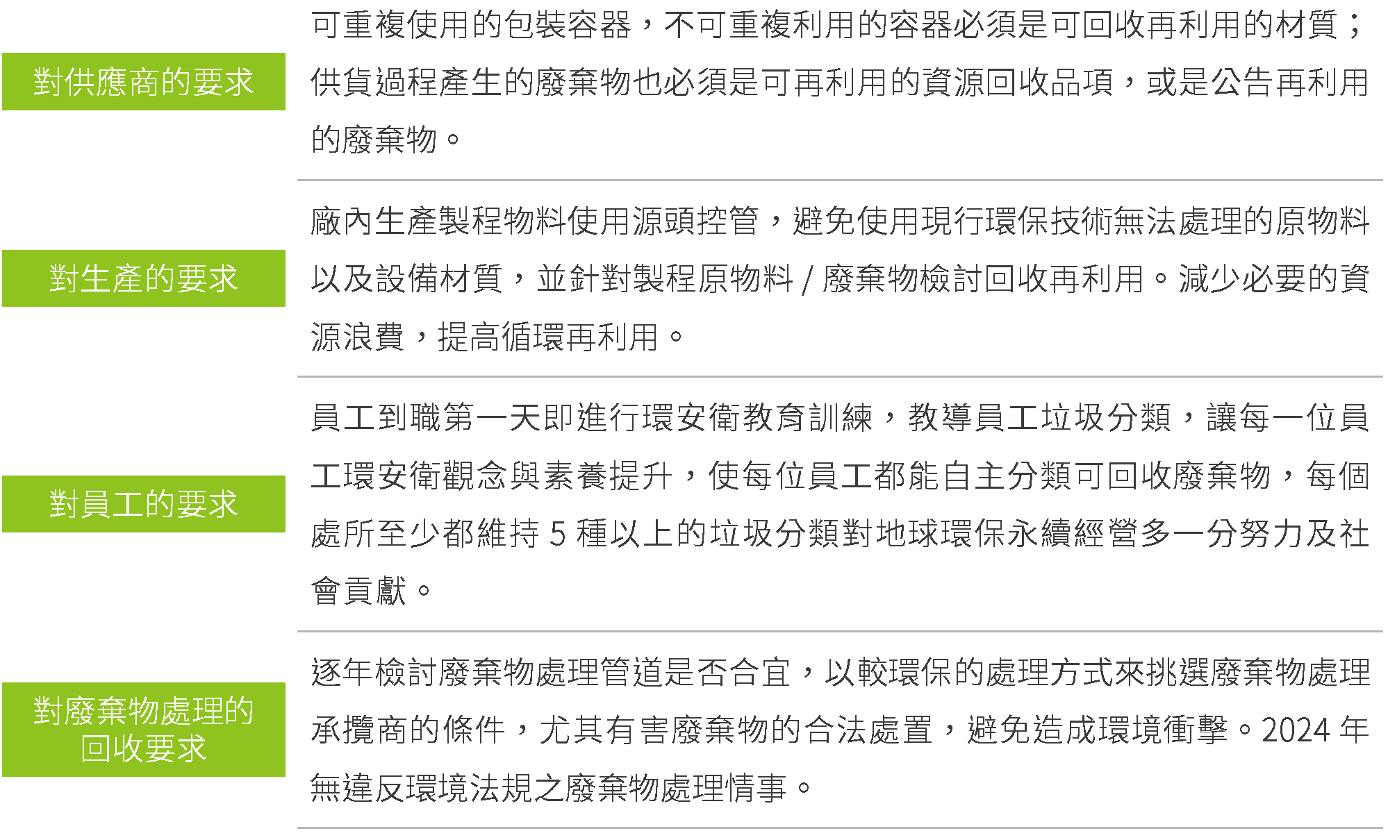 高力廢棄物100%由合法業者處理;無排放任何氮氧化物 (NOx)、硫氧化物 (SOx);用水係自來水,無地表水及海水。