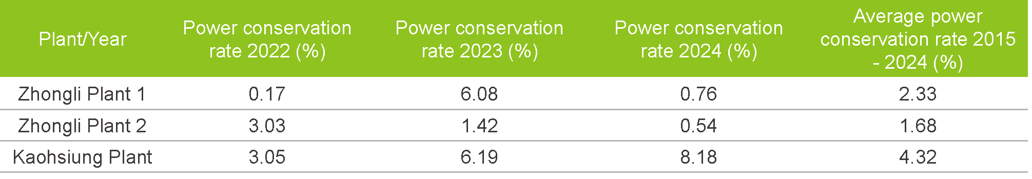 All plant sites comply with the laws of the Bureau of Energy, Ministry of Economic Affairs. As a major energy user that Taiwan Power Company has signed a contract with to supply at least 800 kW of power, the Company reports annual energy performance and improvement plans in accordance with Article 9 of the Energy Administration Act. The Company has set goals to achieve an "annual power conservation rate" or "average annual power conservation rate" of more than 1%. The Zhongli Plant 2 and Kaohsiung Benzhou Plant have appointed dedicated energy management officers to enforce energy conservation plans and achieve an average annual power conservation rate of more than 1%.