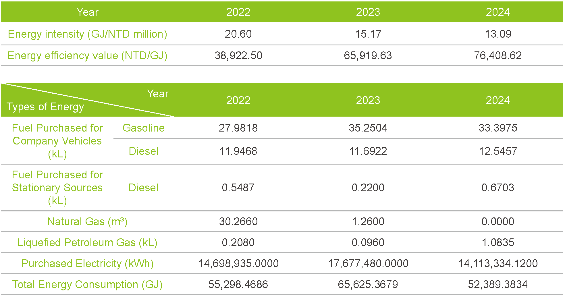 The Company introduces new energy conservation measures on a yearly basis, such as purchasing energy-efficient models, replacing outdated machinery, and optimizing production schedules. Kaori draws on the wisdom of many to achieve energy and carbon reduction goals. In the future, more attention will be directed toward improving production procedures and reducing energy consumption and promoting Kaori as a green, sustainable business. Energy intensity was lowered by 13.71% in 2024 compared to 2023.