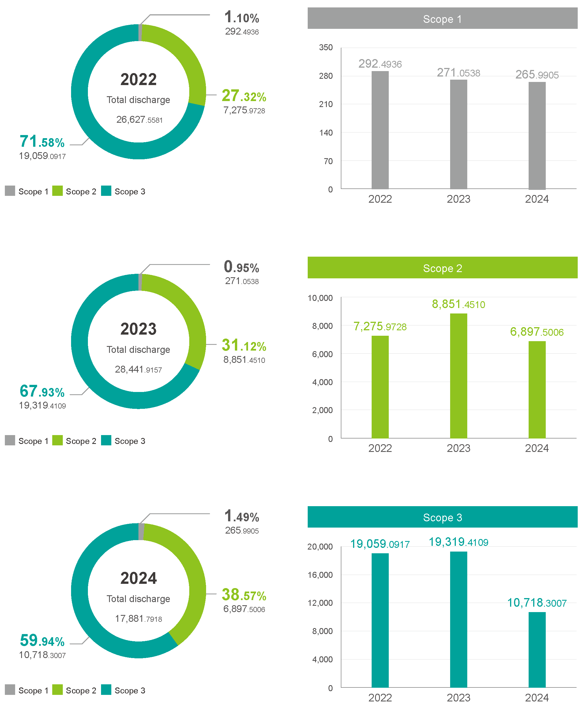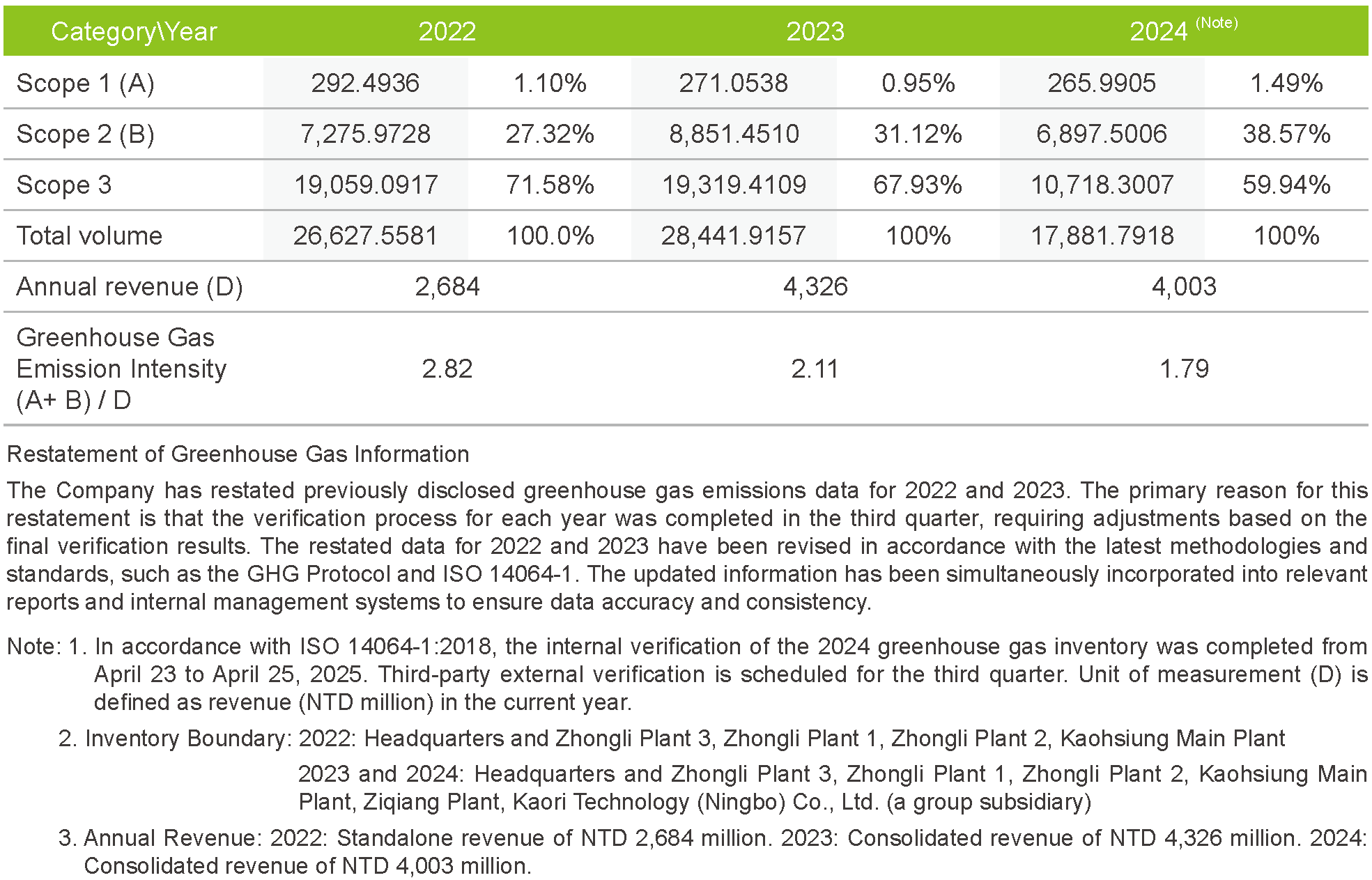 The inventory is conducted in accordance with the ISO 14064-1:2018 Greenhouse Gas Inventory Standard. The boundary scope covers all factories and subsidiaries in Taiwan, with a total of six sites. The internal verification was completed from April 23 to April 25, 2025, and the external verification will be completed in the third quarter of the same year. Driven by the internal Carbon Management Committee, preliminary calculations based on collected data show that total Scope 1 and Scope 2 emissions in 2024 amounted to 7,163.4911 tCO 2e, representing a 15.14% reduction in carbon intensity compared to 2023.