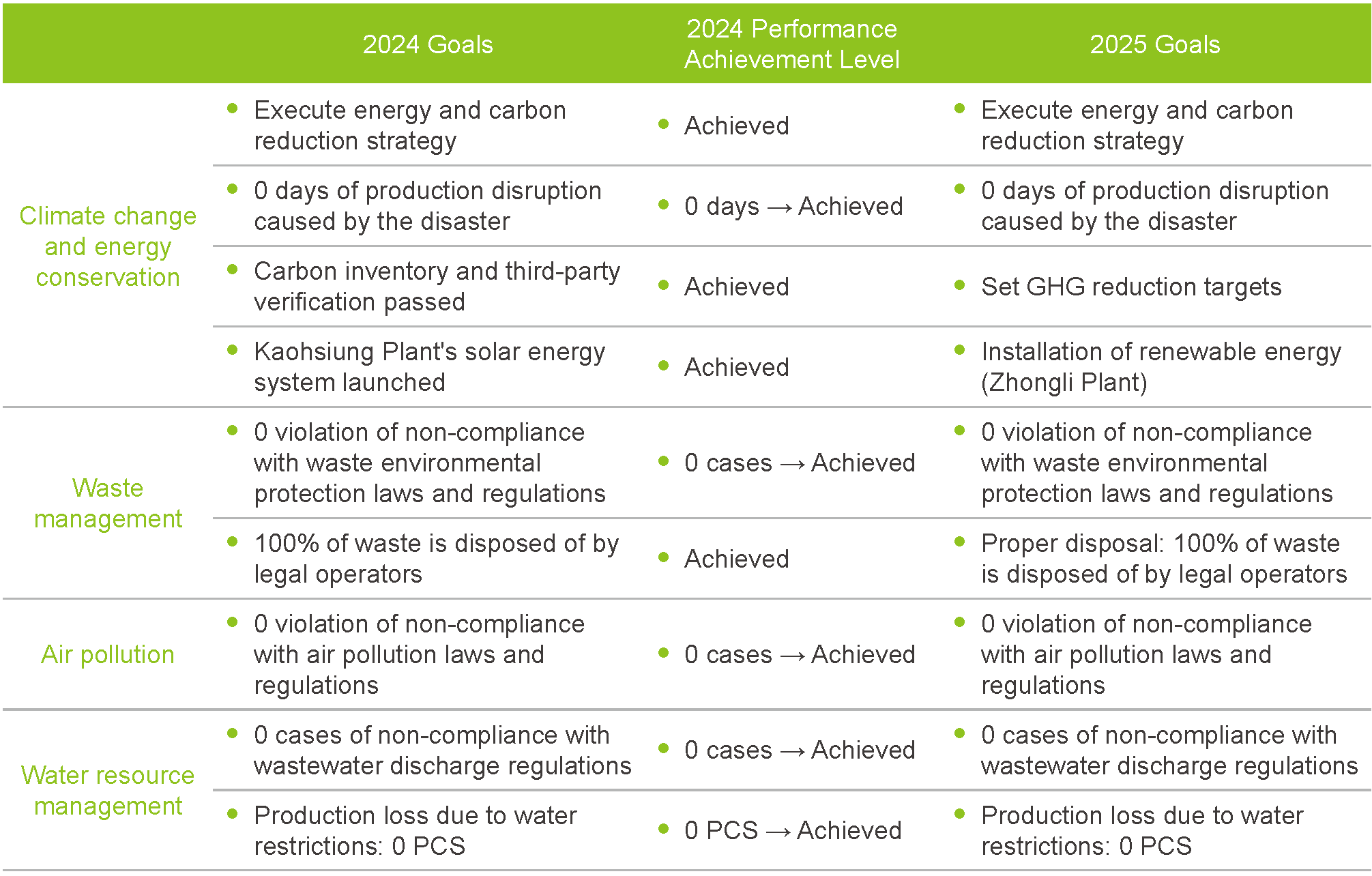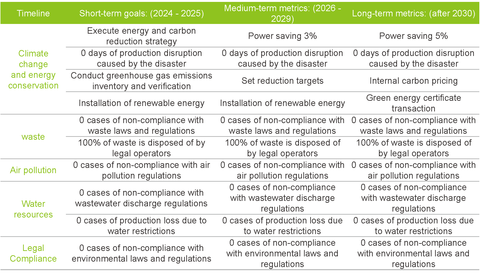 Kaori is committed to fulfilling its environmental responsibility and becoming a sustainable business with continuous improvement. In line with the short-, medium-, and long-term energy-saving and carbon reduction metrics and related implementation plans mentioned above, we have set and achieved performance goals over the past two years (as shown in the table below) to reduce potential impacts on society and the environment.