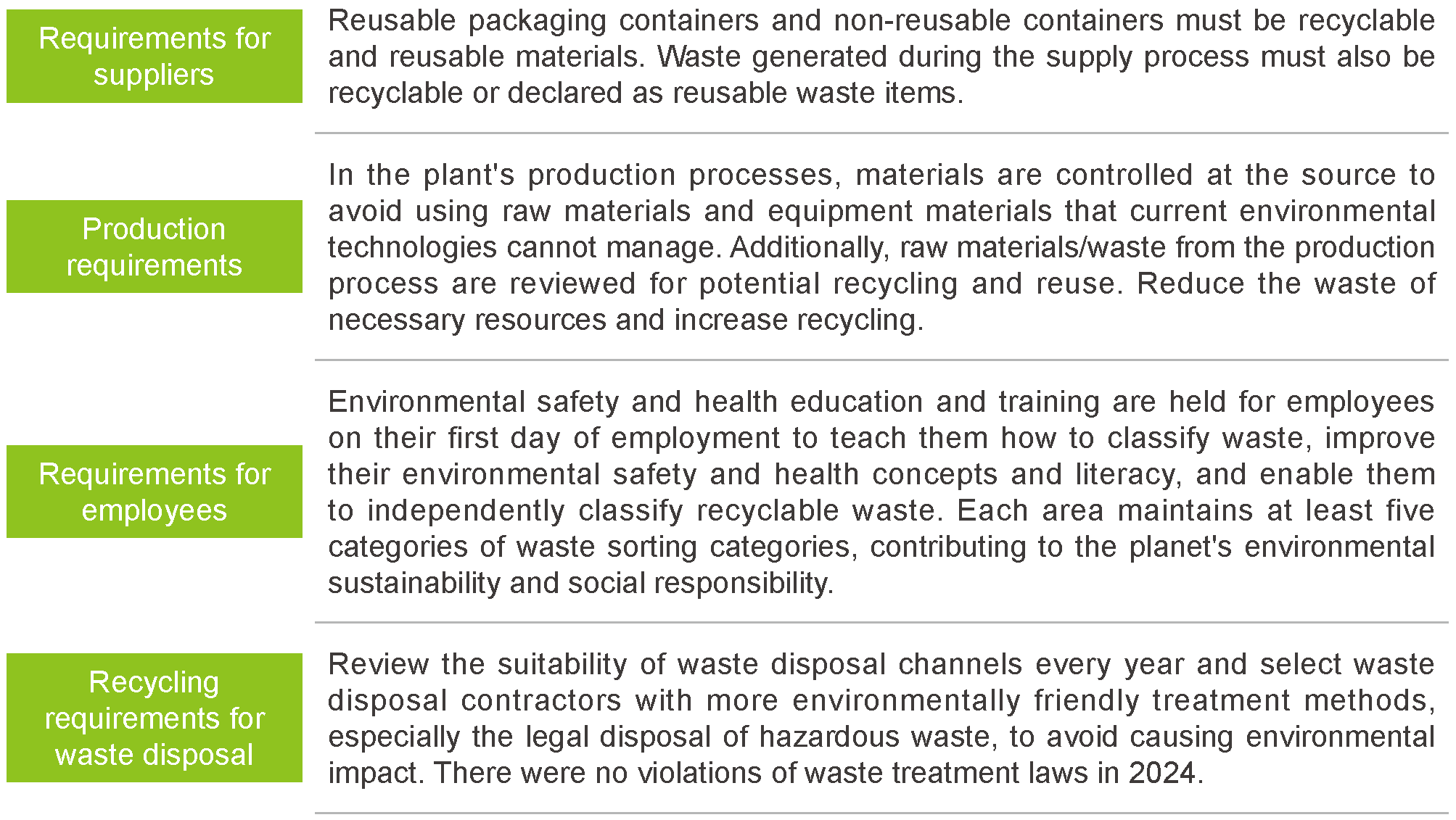 Kaori observes the ISO 14001 standard and has created a dedicated unit to track the sources and volumes of waste. Adhering to the principles of maximizing resource use and minimizing waste generation, the Company promotes "Waste Management Measures." All departments are committed to minimizing waste volumes from production activities, increasing the life cycles of raw materials used, and promoting the circulation and reuse of resources and waste for total waste reduction. Kaori engages qualified service providers to dispose of waste and uses appropriate forms to audit waste handlers, thereby ensuring the appropriateness of waste treatment and that the waste generated does not pose a significant impact on the nearby environment.