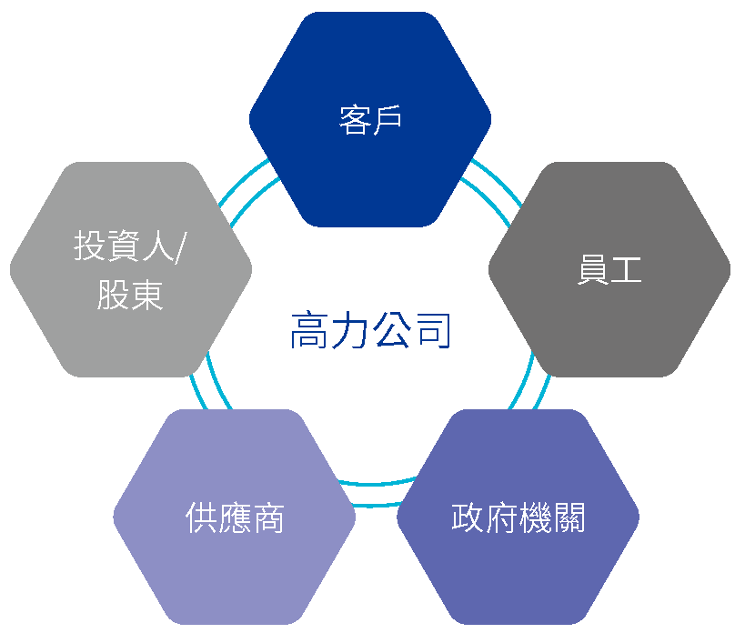 高力ESG 推動小組依循六大篩選原則「責任」、「影響力」、「親近度」、「依賴性」、「代表性」、「政策及策略意圖」,透過問卷進行利害關係人評估與排序,再徵詢外部永續顧問專家進行交叉檢視,確認利害關係完整性,最終透過ESG推動委員會議進行審議與表決。2024年主要的利害關係人為五項,原內部高階主管合併為員工類別,其五項為包含投資人/ 股東、 員工、客戶、供應商、政府機關。透過各種溝通管道 傾聽利害關係人的聲音,蒐集利害關係人對本公司的 關注議題,接受並回應利害關係人的期待。