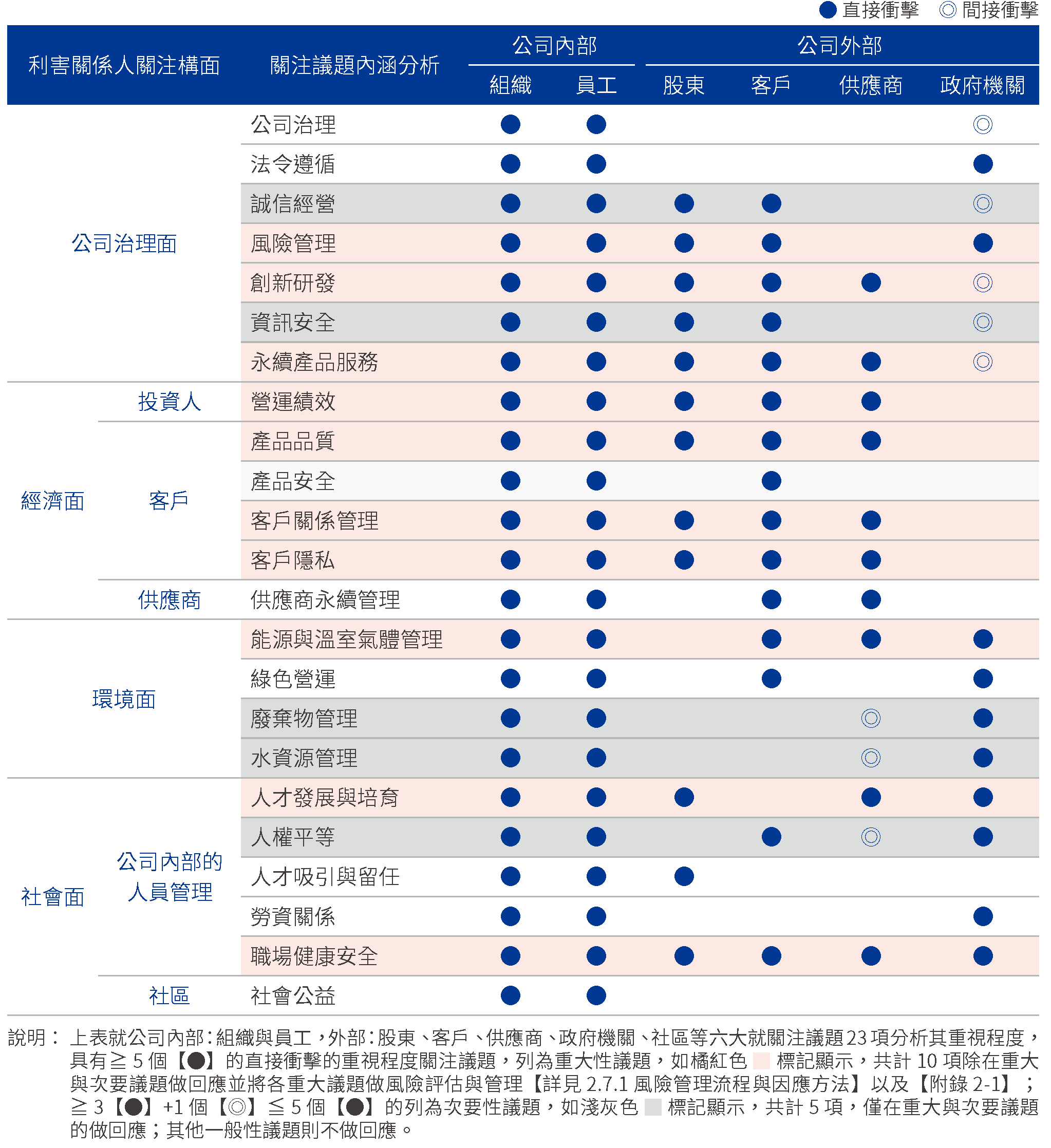 各關注議題對應利害關係人的重大議題考量面予以鑑別,就公司治理、經濟面、環境面與社會 ( 含人權 / 人群 ) 的關注議題對企業內外部範圍鑑別其直接或間接衝擊,並分析對利害關係人的關切程度的 高低,再予以排序。