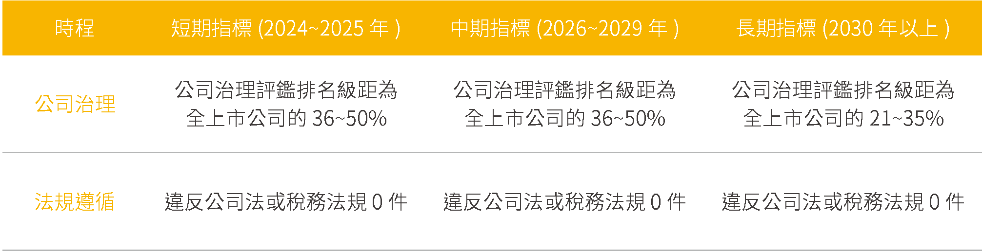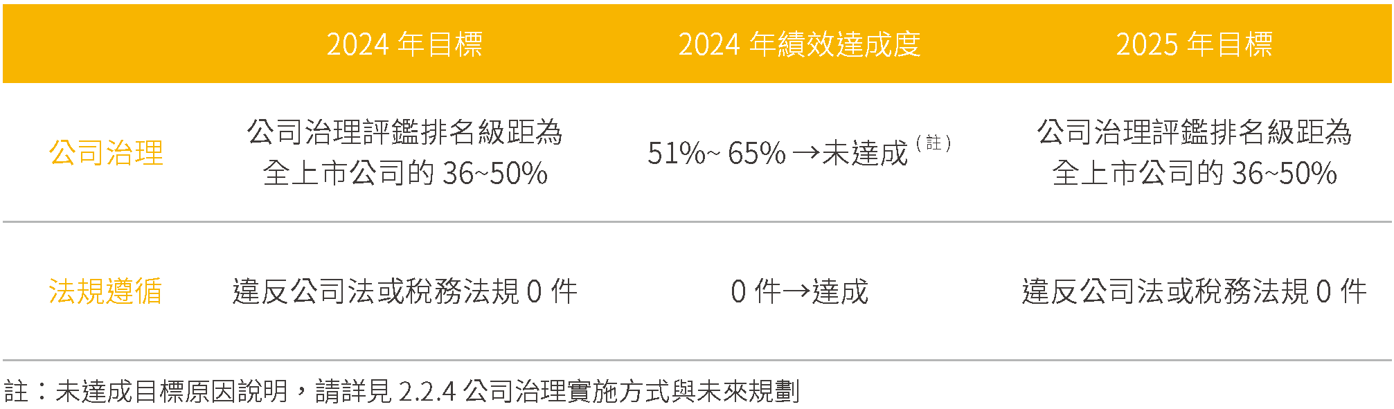高力公司對公司治理與永續經營管理,本著誠信經營與資訊公開透明的理念,遵循法規、提升經營績效,健全內控與人員管理機制與 ISO 管理系統驗證,落實經營理念與道德規範的優質的企業文化, 訂定重大議題目標與績效如下: