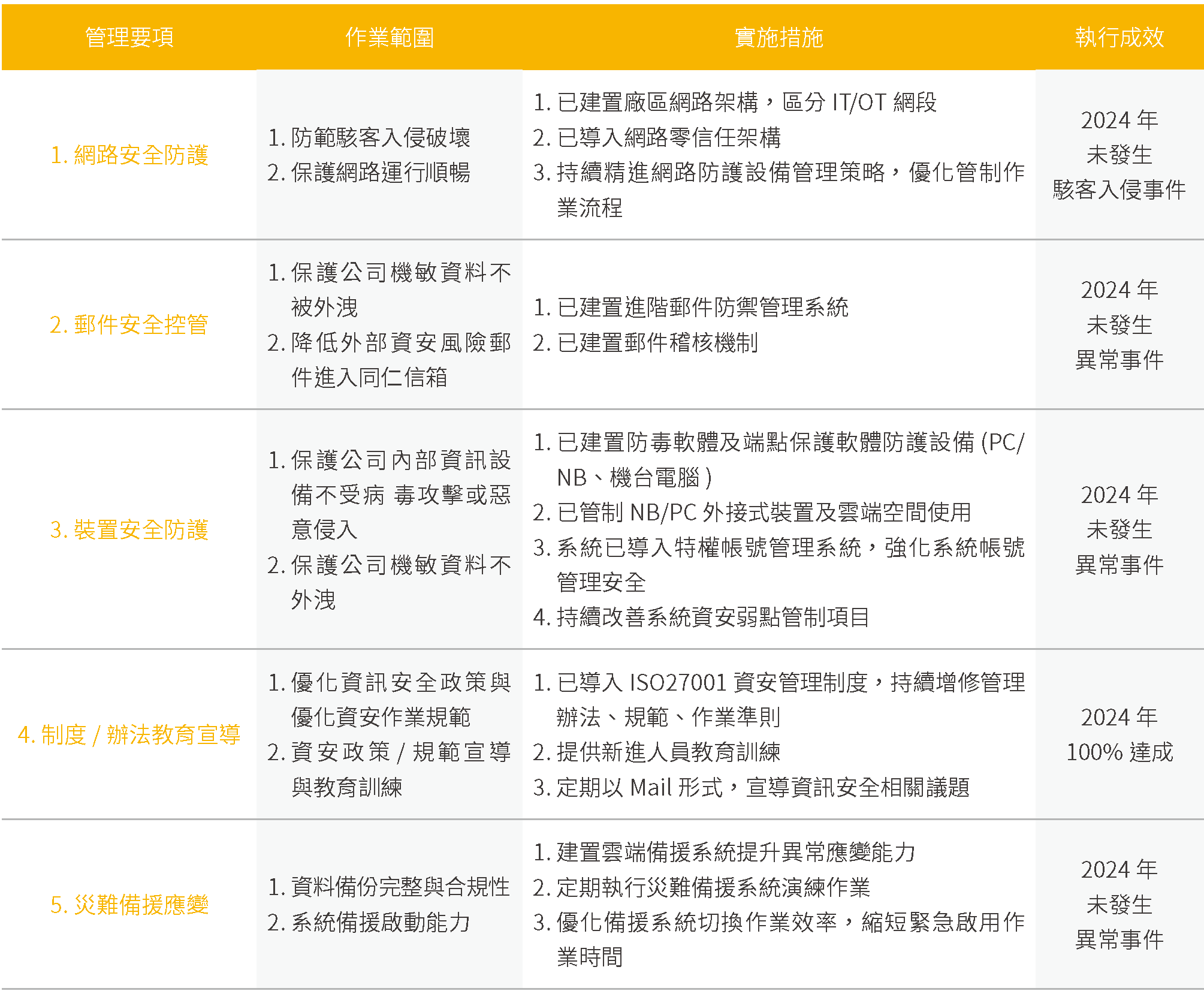 高力依「內外部利害關係方」之關注事項,參照國 際資安管理作業、個人資料保護等標準及法令規 定,訂定本公司「資訊安全管理制度」,確保本公 司資通訊基礎設施、資訊系統符合機密性、完整性、 可用性及合法性要求。2023 年資訊安全管理執行情形已由管理委員會召集人於 2023 年 9 月 27 日向董事會報告。此外,2023 年 12 月通過 ISO 27001 :2022 資訊安全管理系統第三方查驗 作業,並於 2024 年 3 月取得證書。