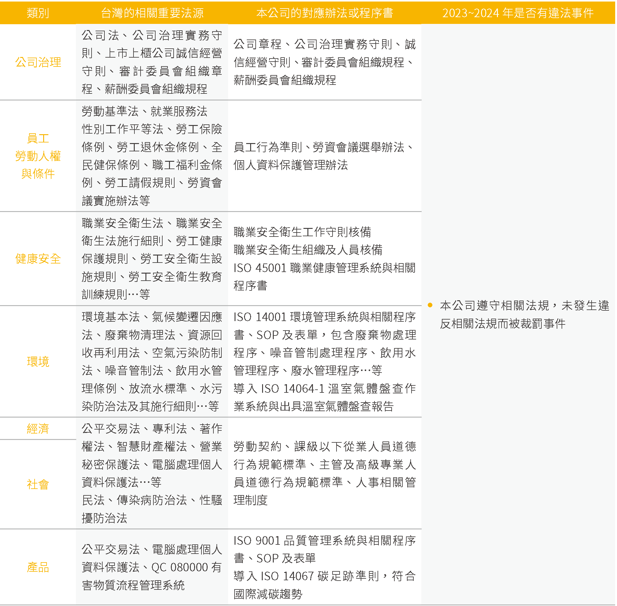 2024年無違反安全衛生、環保、消防等法規之情事紀錄。內部年度稽核無發現重大賠償損失。