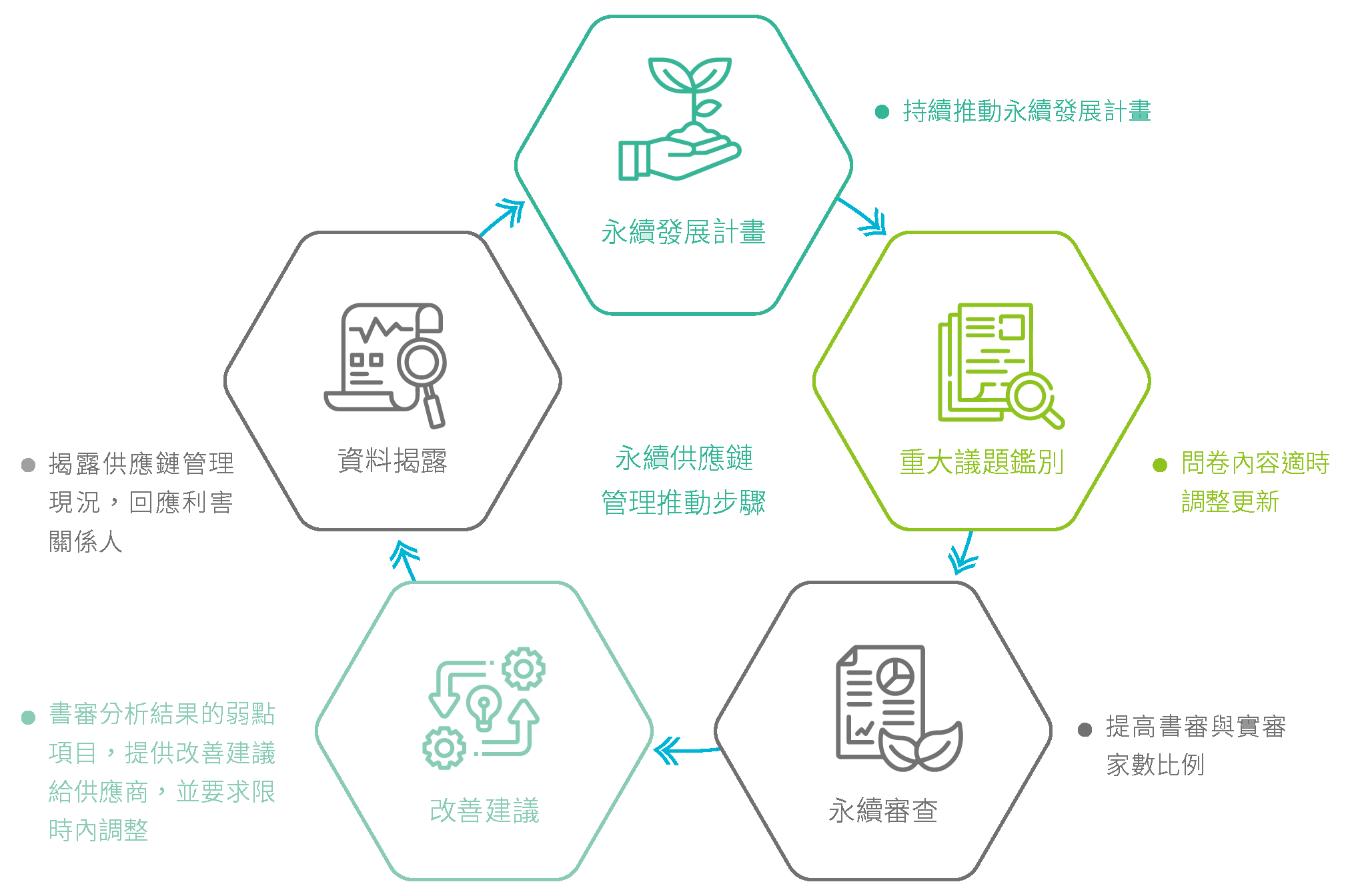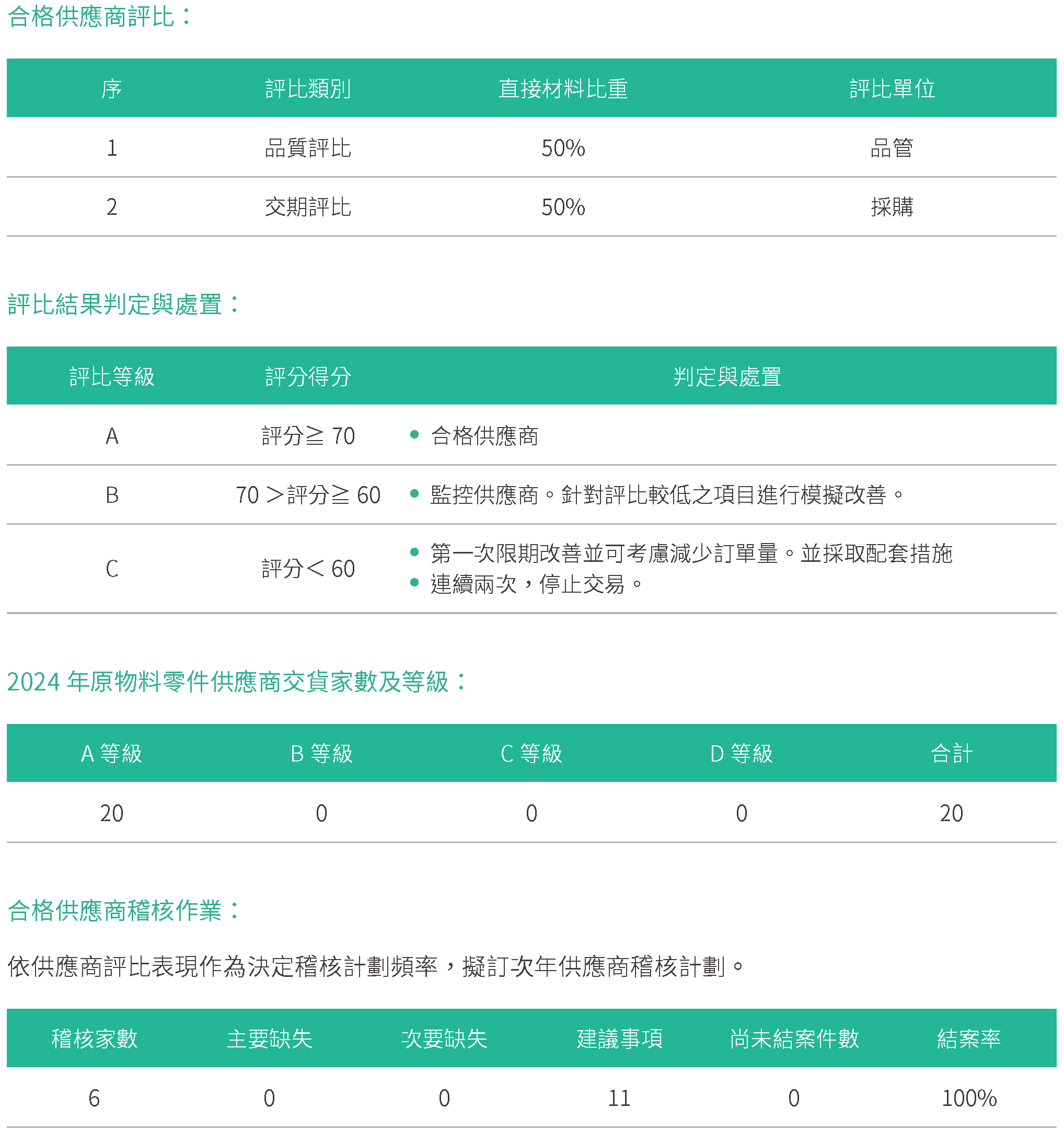 為了有效管理與維護既有合格供應商,定期每年進行供應商稽核,包含品質、交期、服務、技術、 供應商品質系統等評估項目。此外,供應商須提供第三方品質系統驗證證書,以及填寫有害物質 管理問卷。所有原物料供應商均需簽署道德廉潔政策。同時評估供應商是否對於台灣有所貢獻, 非僅以價格做評估,才能充分發揮自身角色與定位。2022 年導入永續供應鏈管理制度,將逐步更換不適任供應商,以建立更強韌之永續供應鏈。