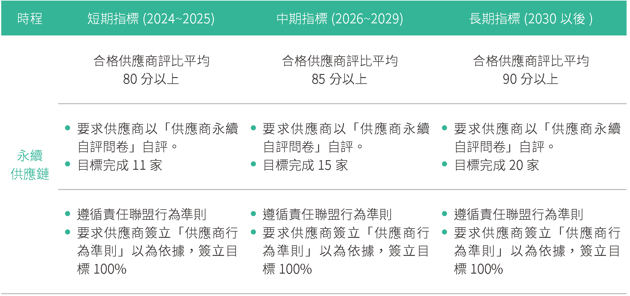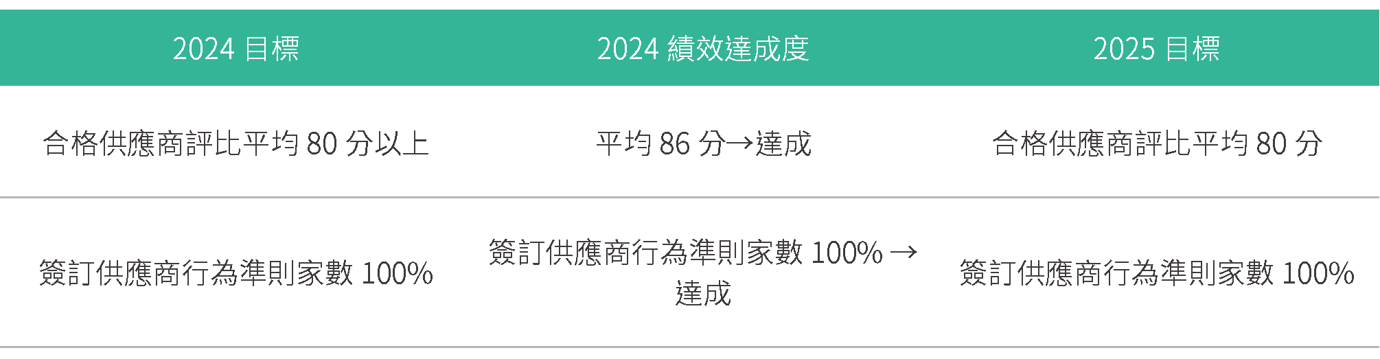 依據責任商業聯盟 (Responsible Business Alliance) 訂定供應商企業社會責任行為準則,作為管理供應鏈的基本價值觀。本準則包含勞工、健康與安全、環境標準、商業道德規範及管理體系,確保供應商的工作環境安全、員工受到尊重並富有尊嚴、商業營運環保並遵守道德操守。本公司要求供應商盡可能避免有關環境、人權 /勞工、企業倫理、勞工標準,及事先預防罷工衍生的停產風險,與供應商建立築共存共榮的關係。